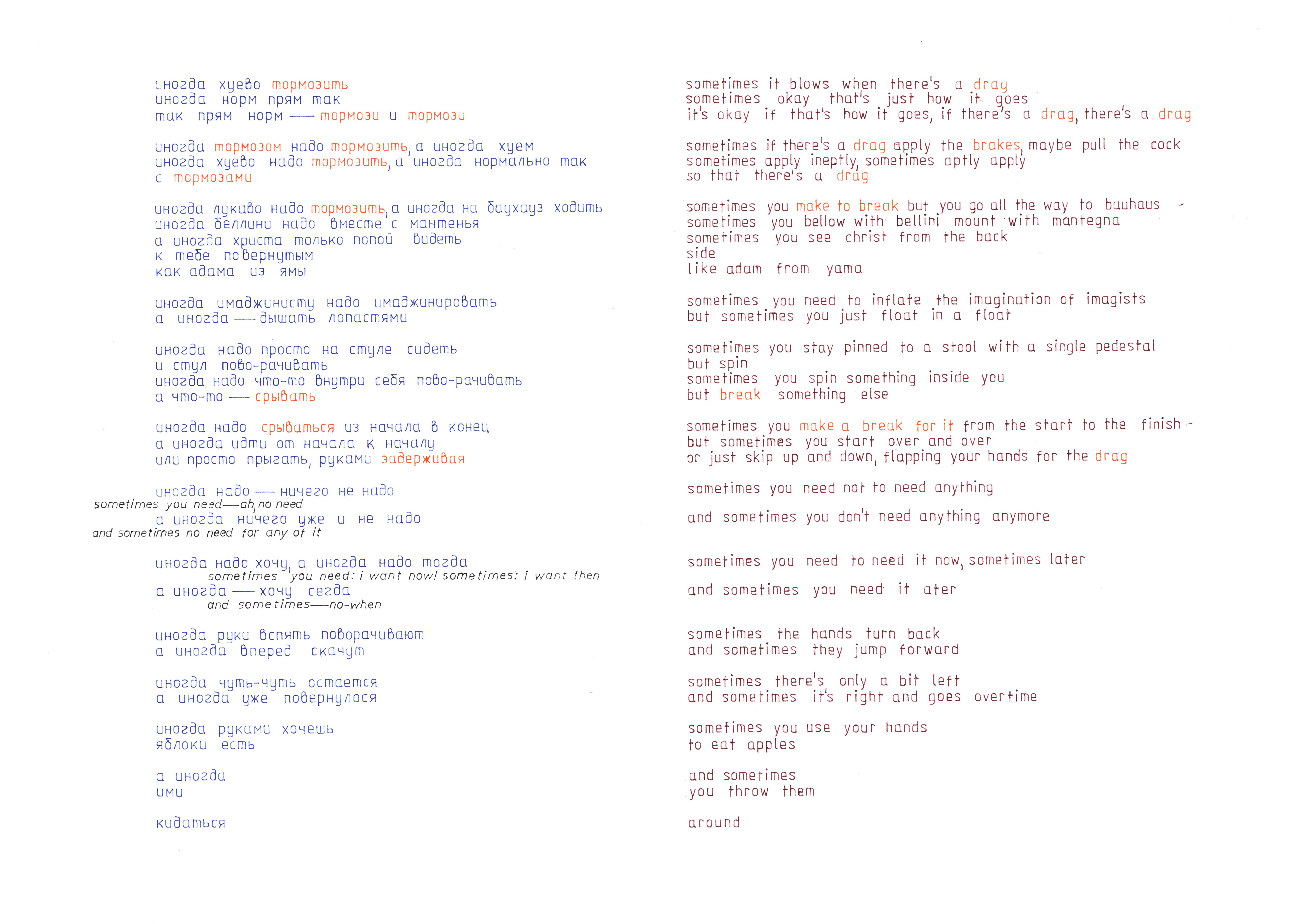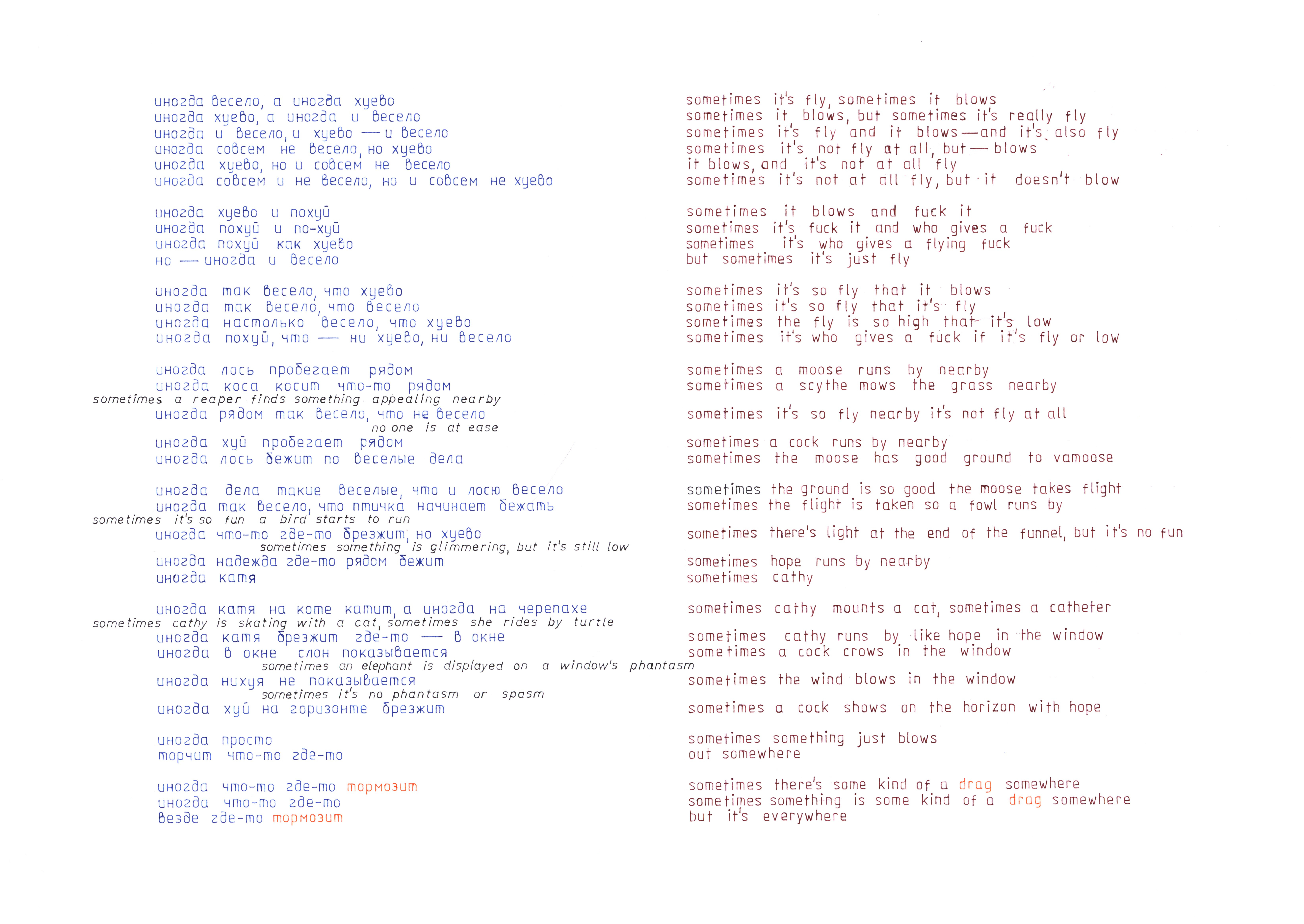[and language shall be given unto you] and [in the beginning was a word] were previously published in Milk Press (PSNY). These poems, as well as the following one, are co-translations with Eugene Ostashevsky. [sometimes it’s fly, sometimes it blows] is part of Over Sight (Eulalia Books).