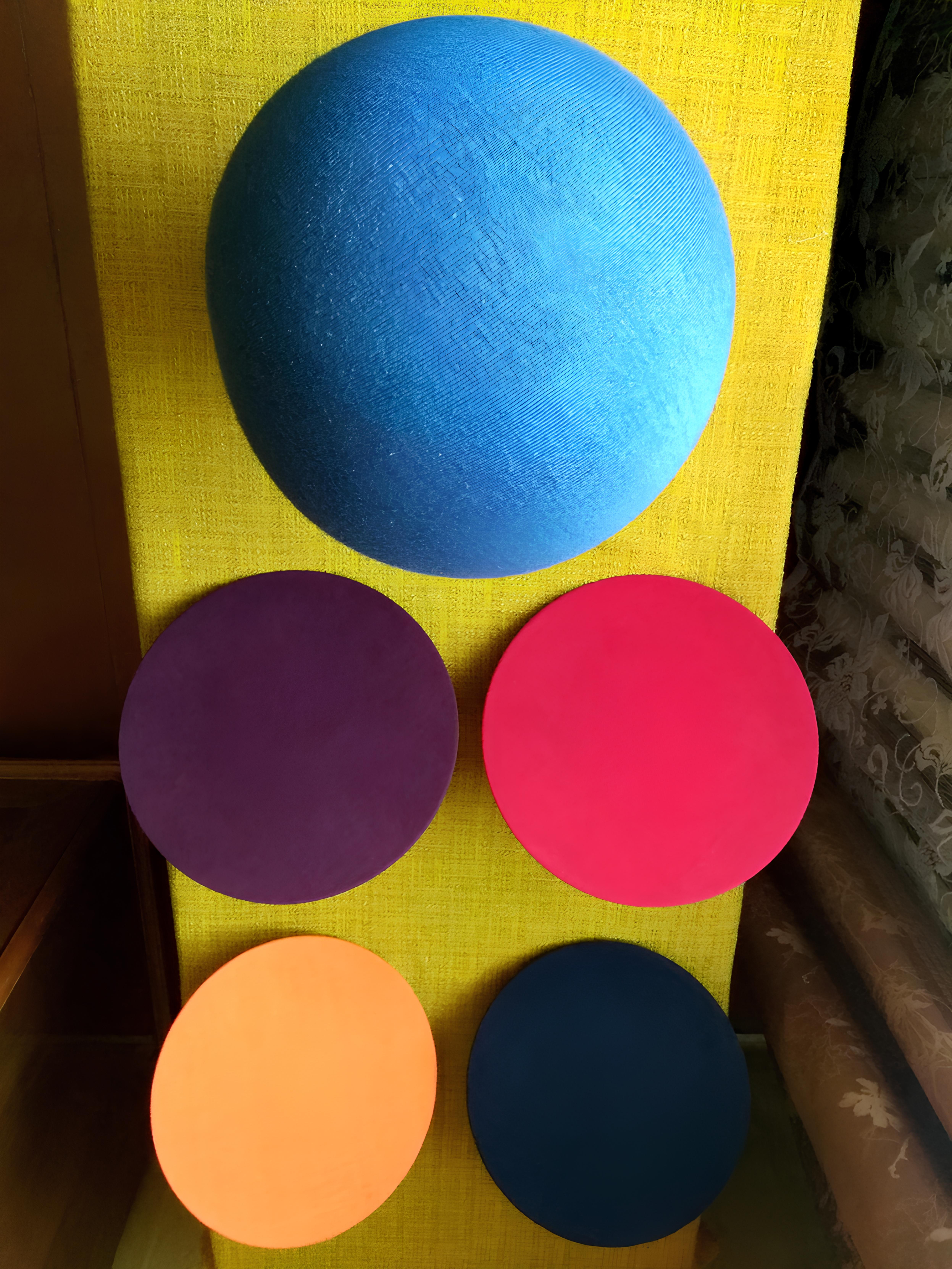 Поскольку в рамках бытового минимализма и мяч, и тарелки одеты в майки, то скрытые узлы сзади не позволяют предметам плотно соприкасаться с поверхностью, что создаёт вот такой эффект отрыва от неё.